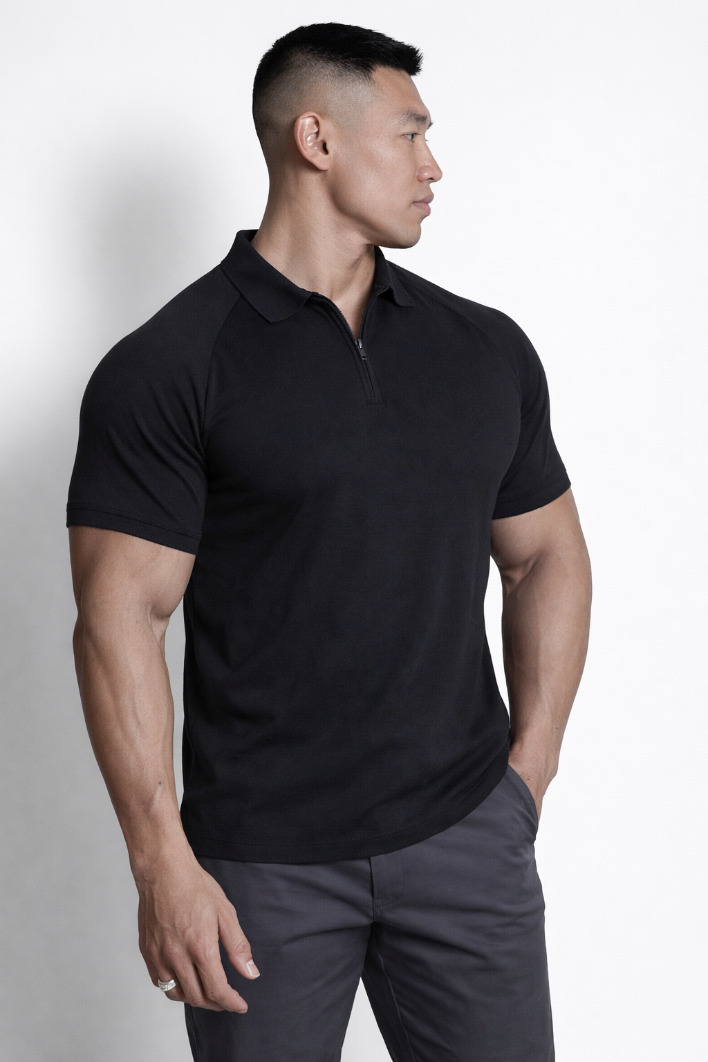 Premium Muscle-Fit Polo Tee w/ Zipper - Black